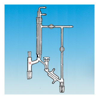 Allihn 球形冷凝管的长度是250mm,冷凝管上面是双开口接头, 用于对体系的惰性气体保护。旋塞阀是2mm 孔径的PTFE 旋塞阀。储液瓶的放液口是14/20 标准磨口, 其他磨口均为24/40 标准磨口。